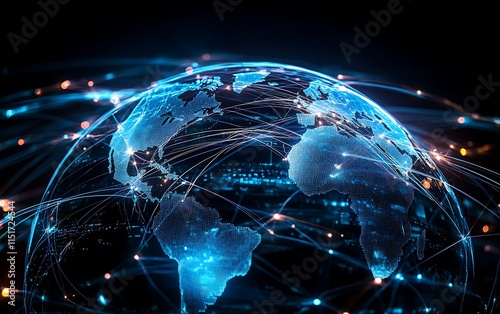 Fototapeta premium Global network connection, digital earth, glowing lines, worldwide communication.