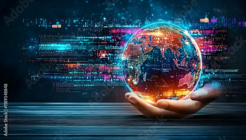 Obraz premium Global network connection, digital earth in hand, data streams background,...