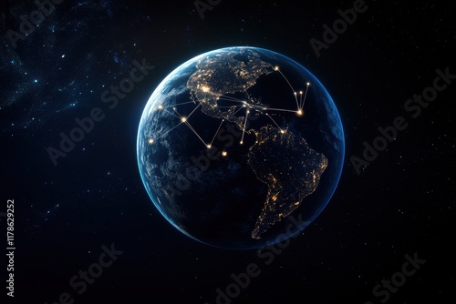 Obraz premium Global network connections, Earth at night, space background, data visualization (1)