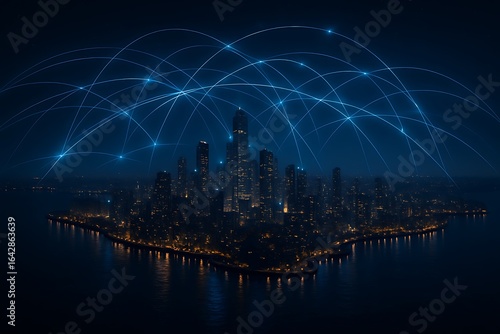 © NeoDesign Hub, Naklejka premium Global network connections overlaying a futuristic cityscape at night