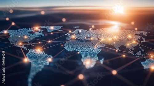 Fototapeta premium Global Network: Digital World Map with Interconnected Lines and Dots on Dark Blue Background with Sunset Glow