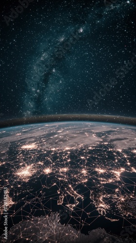 © Narongsag, Obraz premium Global Network Earth at Night Illuminated Cities Space View Milky Way Galaxy