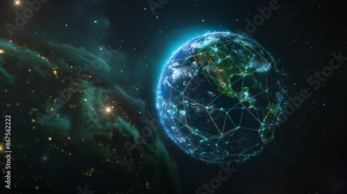Obraz premium Global Network Futuristic Earth Visualization with Vibrant Digital Overlay in Starry Space Background