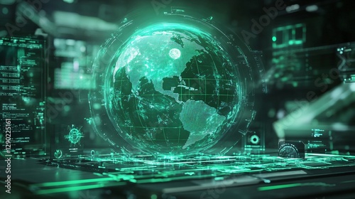 © NguyenThi, Fototapeta premium Global Network Futuristic Holographic Earth on Digital Interface