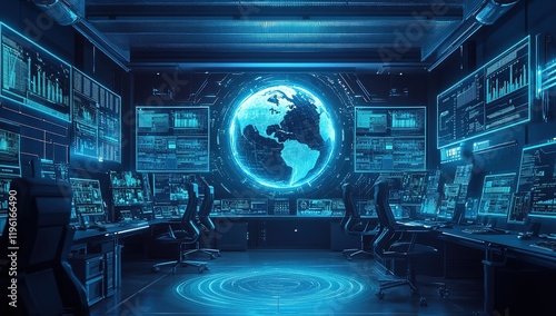 Obraz premium Global Network Monitoring: A Futuristic Control Center Displays Real-Time Data with Advanced Technology.