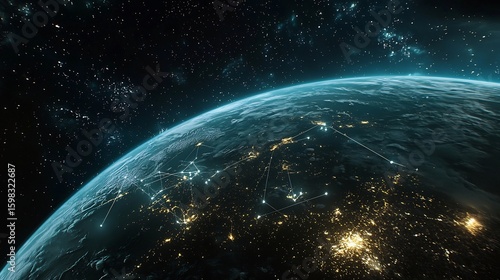 Fototapeta premium Global network nodes connecting continents on a nighttime Earth from space