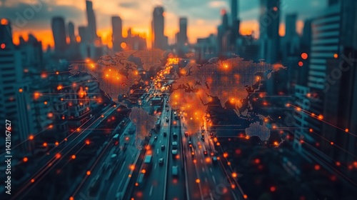 Fototapeta premium Global Network Overlay on Cityscape