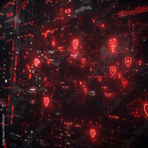 © A4719, Obraz premium Global Network Security Red Alert Digital Map Interface