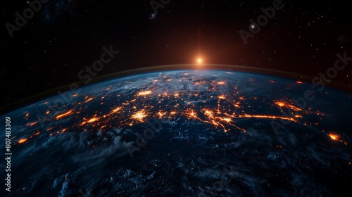 Obraz premium Global network visualization showcasing bright connections across digital...