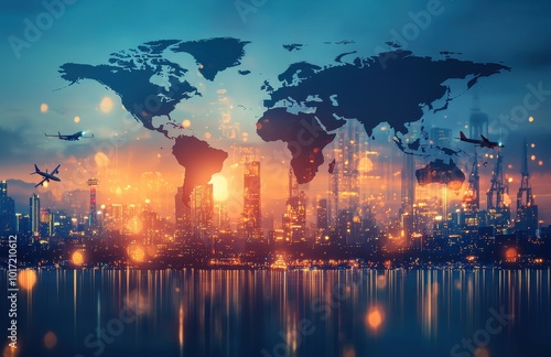 © Georgii, Fototapeta premium Global shipping concept with a cargo ship and digital blue and white world map overlay against a city skyline background at night