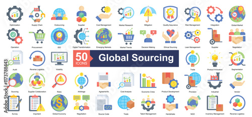 © Syafii5758, Fototapeta premium Global Sourcing Icon Collection Set.Containing optimization, supply chain, outsourcing, supplier, cost management, market research, mitigation icon. Simple flat style Vector Illustration.