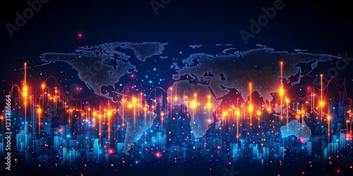 Fototapeta premium Global Stock Market Data Visualization, Financial Chart with World Map, Blue and Orange Candlesticks