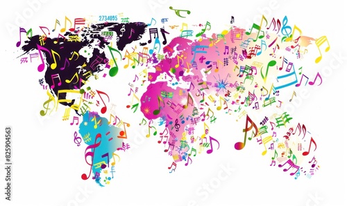 Fototapeta premium Global Symphony: A World Map Composed of Colorful Music Notes and Artistic...