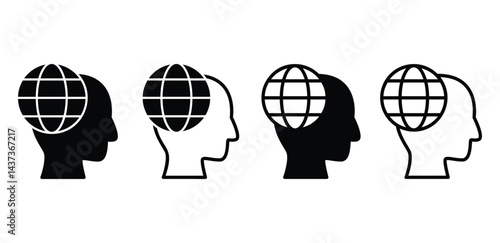 Fototapeta premium Global Thinking Concept Black and White Icon of Human Heads with World Globe Vector Design