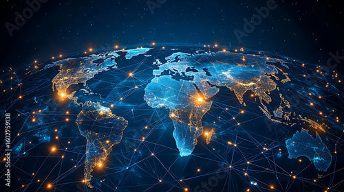 © Thai, Obraz premium Global trade and transportation map with cargo container ships and maritime routes, representing international logistics partnerships and freight services