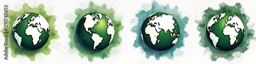 © Viktor, Naklejka premium Global watercolor illustration. Earth planet with green watercolor splashes. Colorful, textured design. Abstract, eco friendly concept. Ideal for global awareness posters. Planet earth isolated on