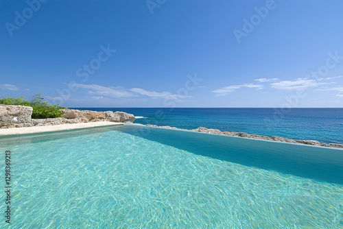 Fototapeta premium Global wellness tourism. Luxurious infinity pool overlooking serene ocean and clear blue sky