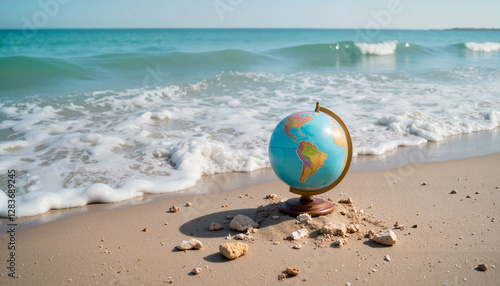 © Larisa, Obraz premium Globe on the beach with waves in the background, travel and exploration concept