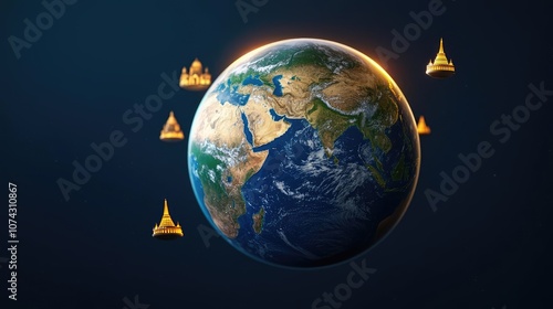 Fototapeta premium Globe surrounded by famous cultural landmarks, dark background, artistic...