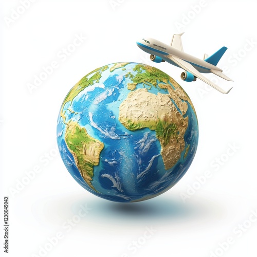 Fototapeta premium globe with an airplane flying around it, placed on a bright white background