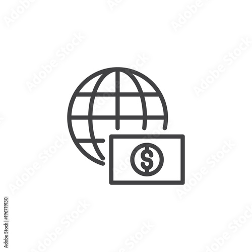 © alekseyvanin, Fototapeta premium Globe with dollar money outline icon. linear style sign for mobile concept and web design. Worldwide money transfers simple line vector icon. Symbol, logo illustration. Pixel perfect vector graphics