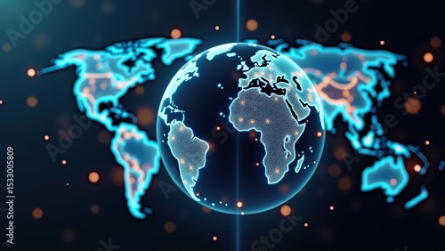 Naklejka premium Globe with real-time glowing data streams (GDP, trade, growth %) connecting continents, upward graphs, deep space backdrop, growth, financial, business.