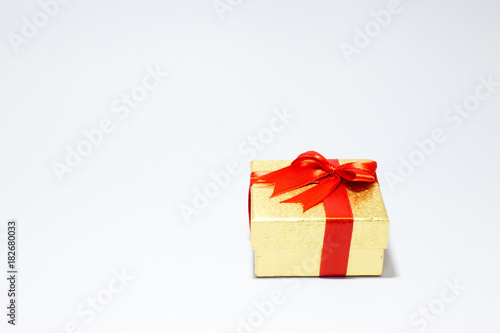 Obraz premium Gloden gift box with red bow on white background