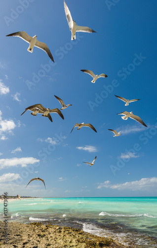 Fototapeta premium Głodny mewa leci nad tropikalną plażą na Kubie.