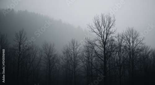Fototapeta premium Gloomy Forest Landscape in the Heavy Fog