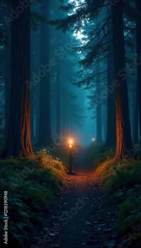 Naklejka premium Gloomy forest path illuminated by a lone candle, trees, wilderness, light