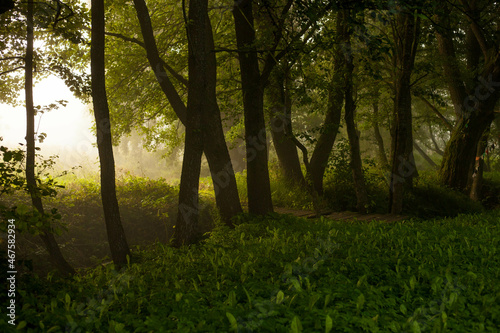 © Dzmitry, Fototapeta premium Gloomy photo of trees with leaves and grass in the forest in nature