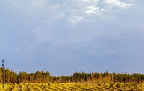 © VASILEVS, Obraz premium Gloomy sky over field and forest.