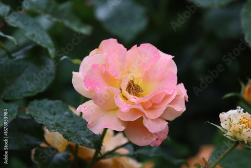 © Діма Осташук, Fototapeta premium Gloria Dei Peace Rose Madame Meilland with Soft Yellow and Pink Petals