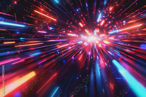 © PHAISITSAWAN, Fototapeta premium Glossy black surface with glowing red and blue neon lines. represents the data network.