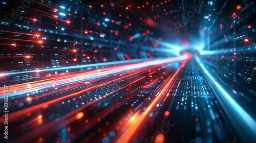 Obraz premium Glossy Black Surfaces with Glowing Red and Blue Neon Lines: High-Speed Data...