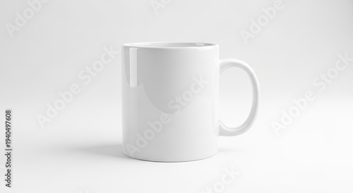 © irvan, Fototapeta premium Glossy blank white ceramic mug soft neutral studio background, mockup design concept