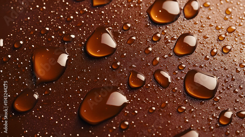 Fototapeta premium Glossy chocolate syrup droplets on a warm brown background.