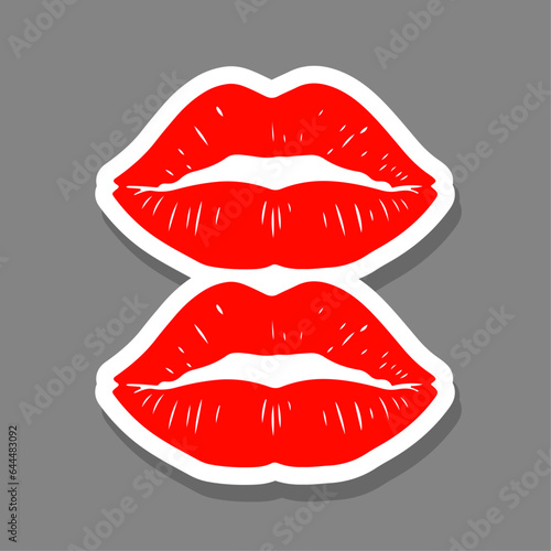 Obraz premium Glossy colored and sexy red lips. Vector illustration isolated on white background. Hot kiss sticker lips with red lipstick