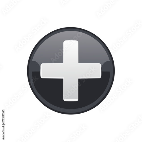 Obraz premium Glossy dark grey circular button with white plus sign symbol for user interface