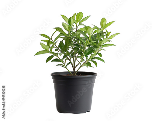 © Dece Std, Fototapeta premium Glossy green shrub in a black plastic pot, isolated on a dark background