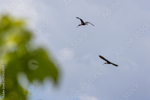 © João Macedo, Obraz premium Glossy ibis birds flying in cloudy sky with green leaves