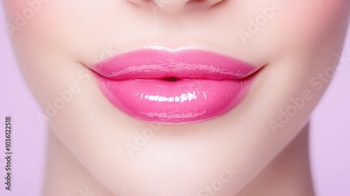 Obraz premium Glossy pink lips close-up, soft pastel background, perfect lip makeup, feminine beauty, smooth lip texture, minimalism, beauty and skincare, vibrant lip color, fresh look