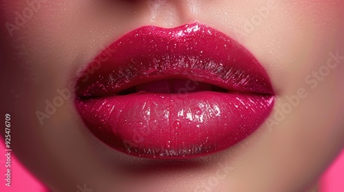 © Светлана Гуркова, Obraz premium Glossy pink lips with shimmering texture against a vibrant background