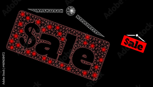 © Evgeny, Obraz premium Glossy polygonal mesh web sale announce icon with glitter effect on a black background. Network sale announce iconic vector with illuminated spheres in bright colors.