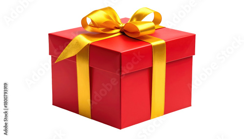 © Fitri, Obraz premium Glossy red gift box with bright yellow ribbon and bow, isolated on black