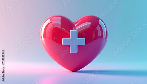 Obraz premium Glossy Red Heart with White Medical Cross Symbol on a Gradient Background.