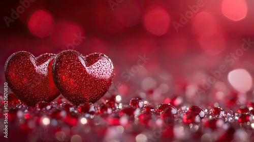 Fototapeta premium Glossy red hearts on a vibrant red background create a romantic Valentine's...