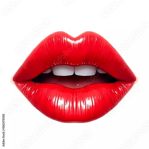 © Julija, Obraz premium Glossy red lips highlights a perfect application of lipstick, emphasizing beauty standards and makeup artistry. Glossy red lips with a bold shine against a clean white background. Generative AI.