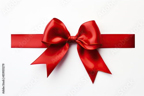 © Anjali, Fototapeta premium Glossy red ribbon with bow, ideal for Christmas gifts, on white backdrop