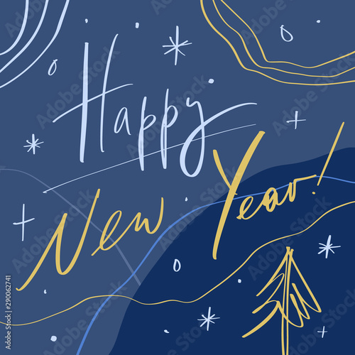 © Knstart Studio, Naklejka premium 2020 Glossy Shine Christmas Concept Design Happy New Year, Xmas holidays Hand Chill Party Modern Abstract Shapes Written Lettering Decor Elements Golden Stars Isolated On Dark Background. Vector